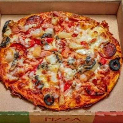 Tomato base, cheese, ham, cabanossi, pepperoni, mushroom, onion, capsicum, bacon, pineapple, olives, prawns & anchovies