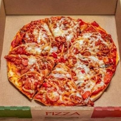 Bolognese sauce, cheese, spaghetti, cabanossi, mushroom, onion. capsicum & bacon