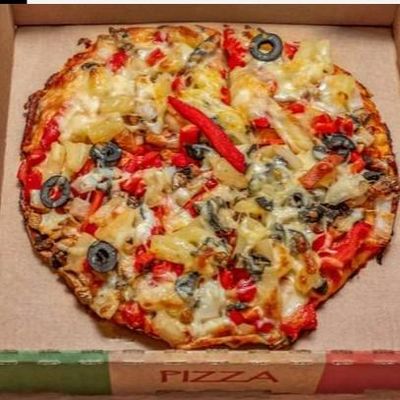 Tomato base, cheese, mushroom, capsicum, onion, bacon, pineapple, chicken & garlic